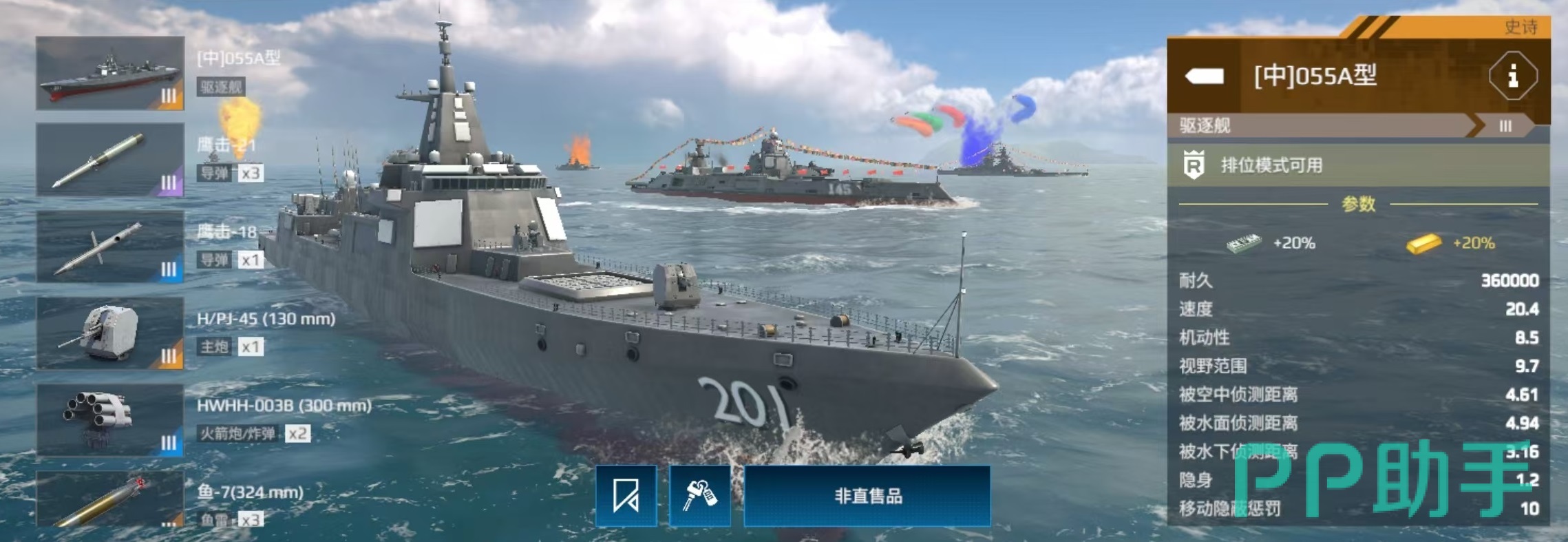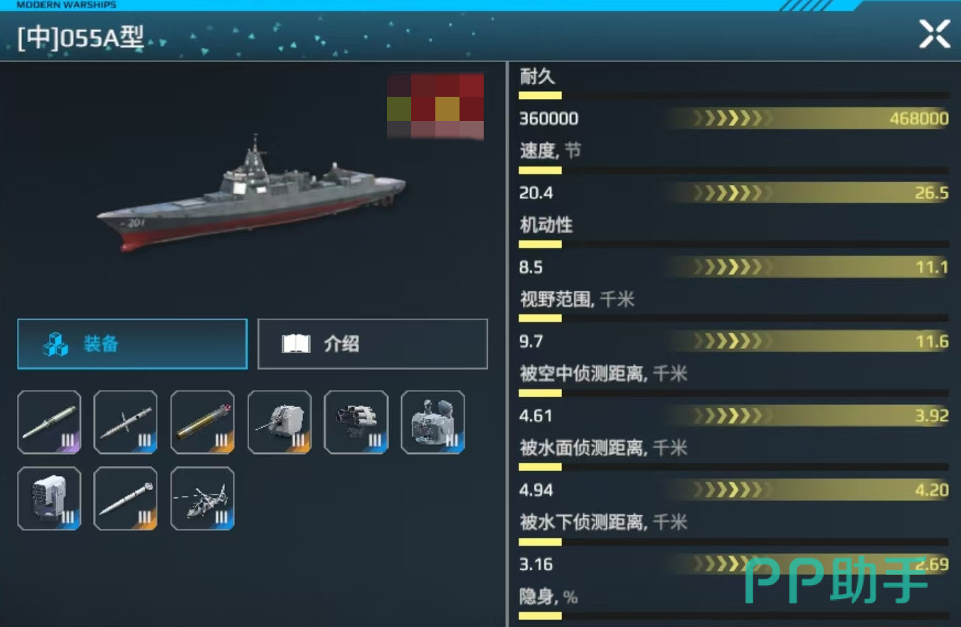先来看一下055a的基础属性,如果能够提升到满级状态,那么耐久为468000,速度26.5节,机动性11.1,视野范围11.6千米,被空中侦测距离3.92千米,被水面侦测距离4.20千米,被水下侦测距离2.69千米,隐身能力为5%。所携带的武器包括四座导弹,三具鱼雷发射器,一座主炮,两具火箭炮,七座防空和一架直升机。