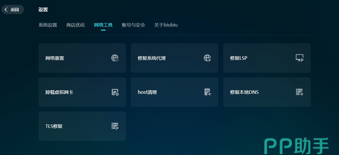 biubiu这里除了简单的加速功能,还有一些小工具很好用,有时候大家会遇到网路设置出错的情况,使用修复功能可以让其自检,有问题帮我们修正,这样大家的网络状态会更好的。
