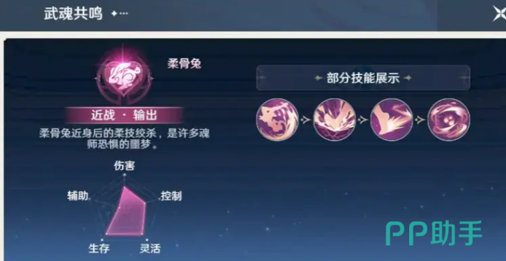 柔骨兔:近战输出半肉的定位还是比较独特的,这一个武魂就可以让使用者拥有比较出色的近战能力。可以直接打出高额的伤害,而且还会具备防御的能力,可以承受一部分的伤害,在战斗的过程中可以灵活的穿梭。