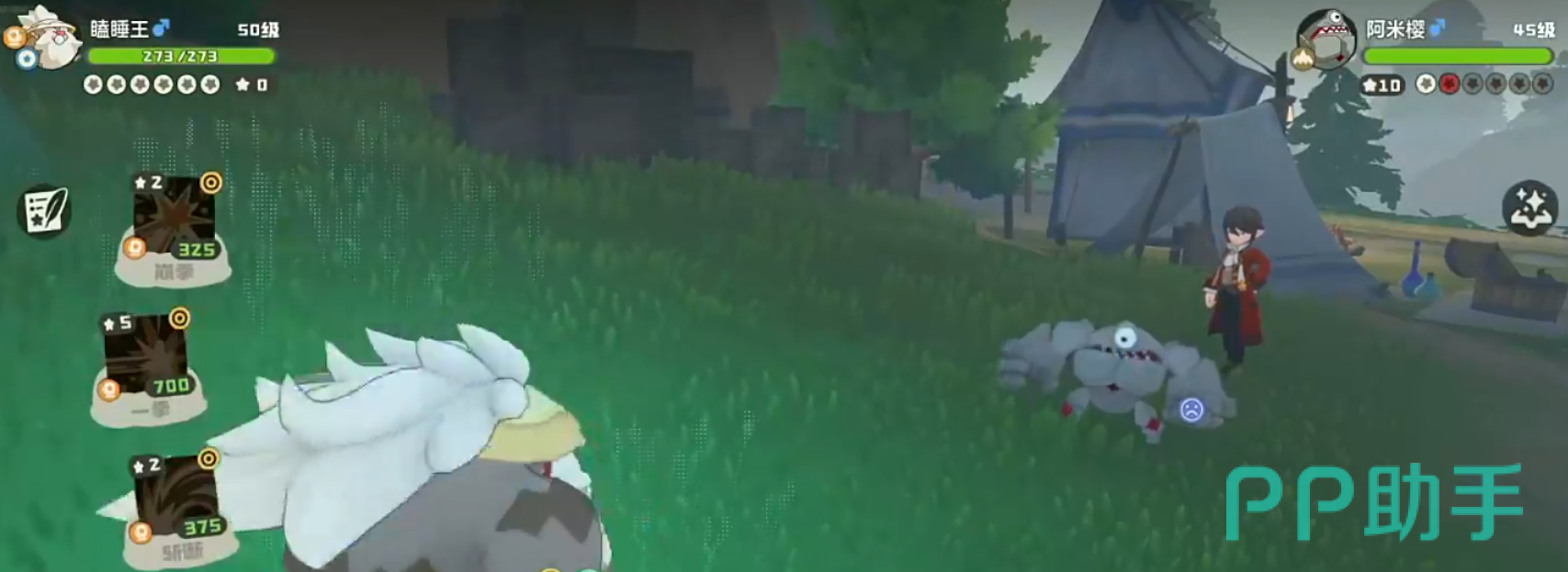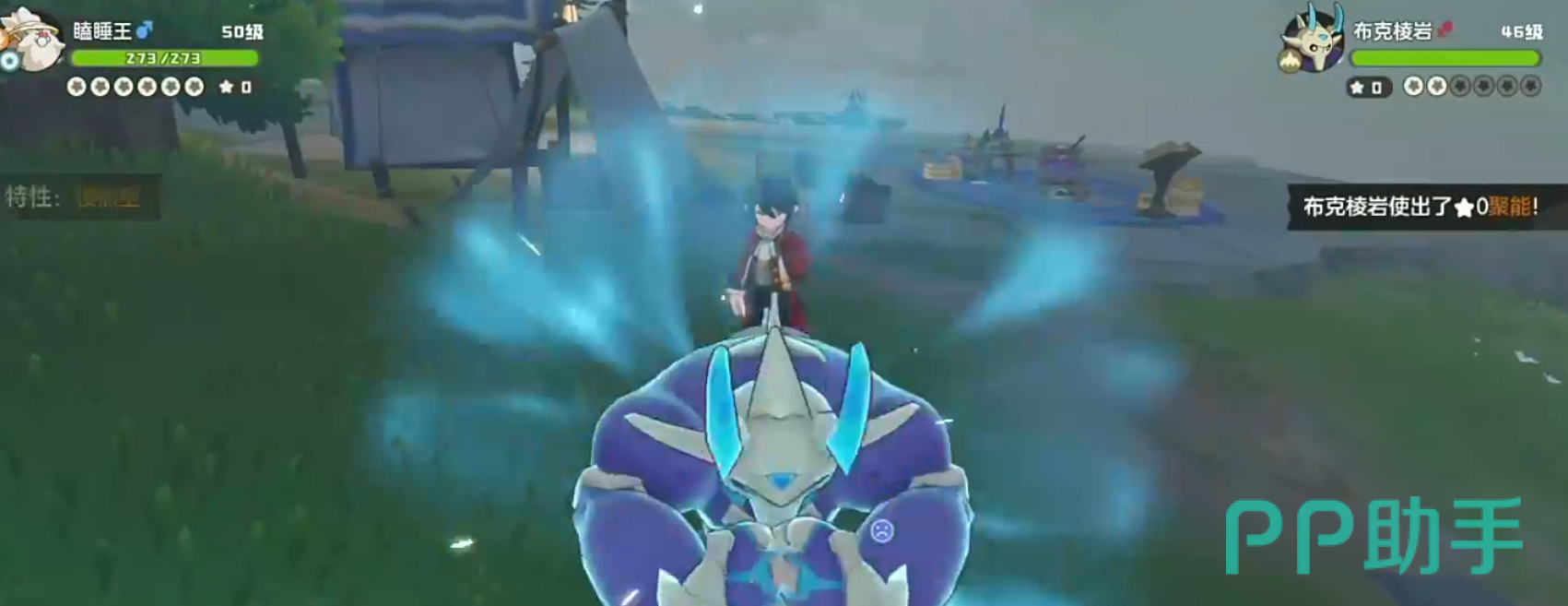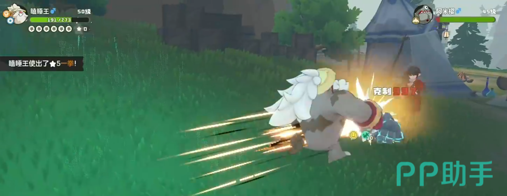 他的第二只会上场地系的阿米樱,这里我们不用切换精灵,继续使用瞌睡王,靠着随机技就能将其带走,接下来的第二场战斗弗拉迪依然会是2点魔力值,他的第一只同样会上阵布克棱岩。