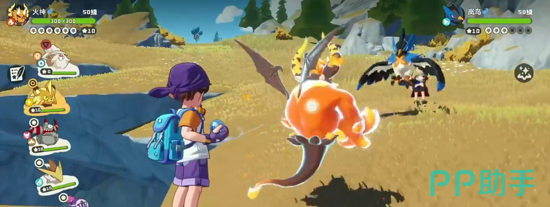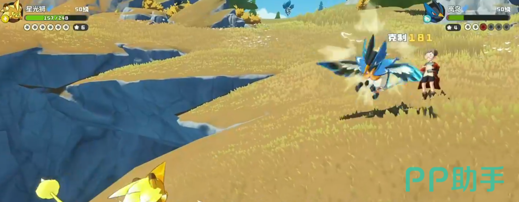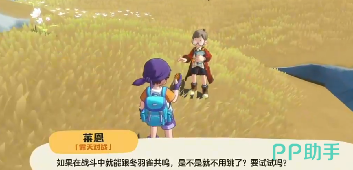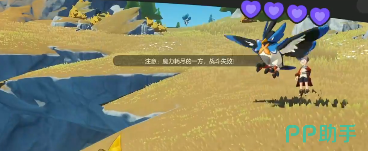 莱恩是一位小孩,对话后就会开启第一场战斗,对手拥有3点魔力值,全体属性是随机技能能耗减3,他上场的第一只翼系的岚鸟,建议换电系的电光狮上场,基本上最多两发2星的离子火花就能带走。