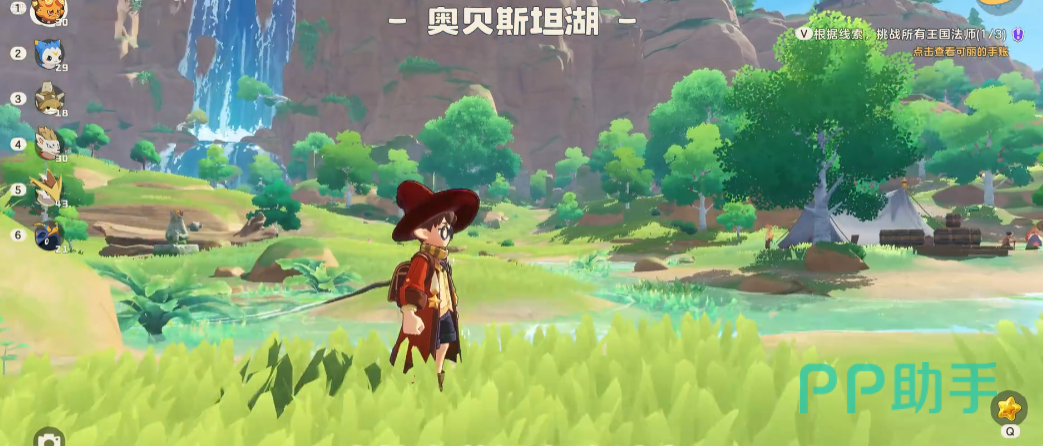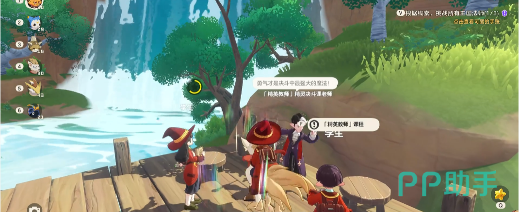 任务会给到三个提示,找到对应的三个教师,教师的位置在地图上进行了标记,玩家们在进行之前也记得做标记,标记方便追踪。先看瀑布脚下的精英教师,直接传送到奥贝斯坦湖传送点,到了之后直接奔跑向瀑布的方向,瀑布下面有一个老师,和一群学生对话,然后与老师对战即可。