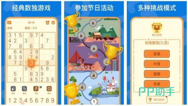这是一款数学主题的休闲益智手游,玩家朋友可以根据自身的水准选择不同的难度,五六年级的小学生用来休闲益智再合适不过。《数独!》中为大家提供了海量各式关卡。以九宫格为例,大家将面对由九个3乘3小方格组成的9乘9大宫格。题面会根据不同难度提供部分已知数字,通过横9格、纵9格、3乘3小格,这三种状态下,填入1到9这9个数字且不重复,极为完成数独填空。
