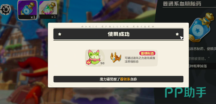 接下来再回到精灵页面,玩家打开需要使用该药水的精灵,长按精灵界面,点击背包当中的首领血脉密药,就可以直接给精灵使用,然后将精灵觉醒首领形态,在精灵完成首领形态进化后可以完成等级突破,且各方面基本属性都会有所增加,除此之外,习得的技能数量也会有所增加,在野怪的捕捉速度上也会更快。