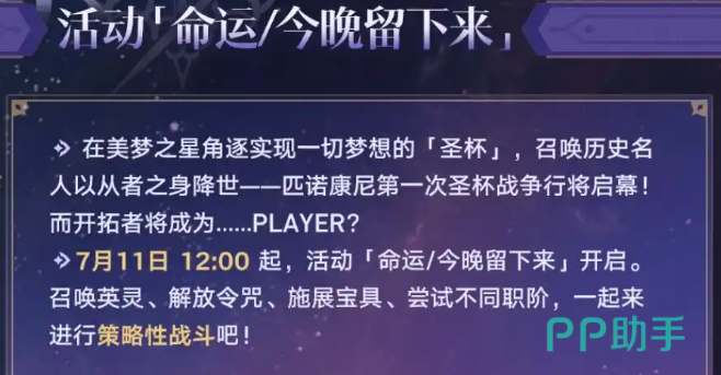 在联动期间,也会增设联动活动,联动活动的名称叫做“命运今晚留下来”,于7月11号开始,玩家就可以通过召唤英灵,解放令咒的方式,来展开数个策略性战斗,该玩法也是和fate的主要剧情将融合的。