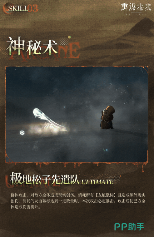 嚼嚼松果抵达洞悉一层时,在其他队友释放大招期间,嚼嚼松果都可以获得友谊徽标,如果嚼嚼松果的洞悉层数达到了三层,那么嚼嚼松果就能够根据,友谊徽标的层数,同步获得进行数值,并且释放大招期间,不会消耗任何的行动点数。