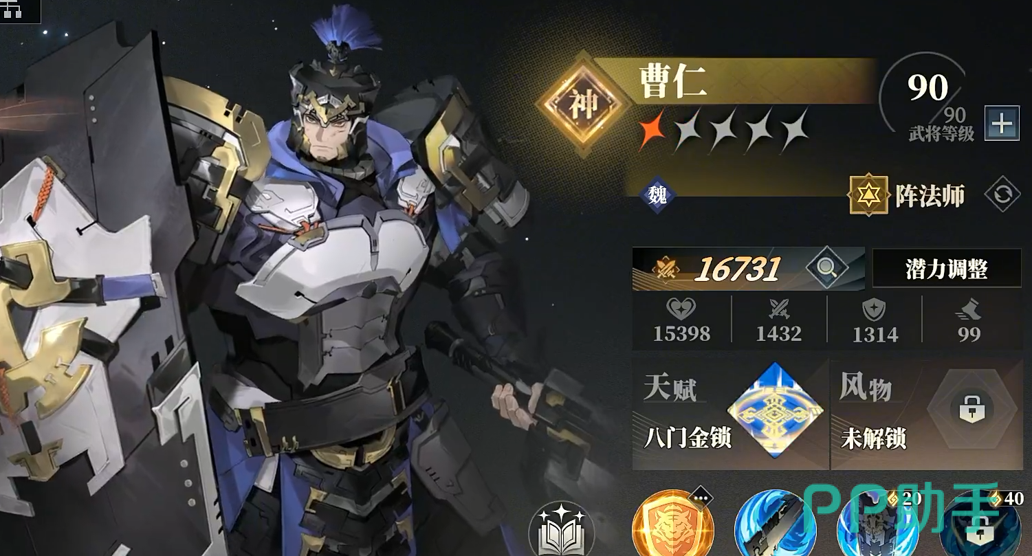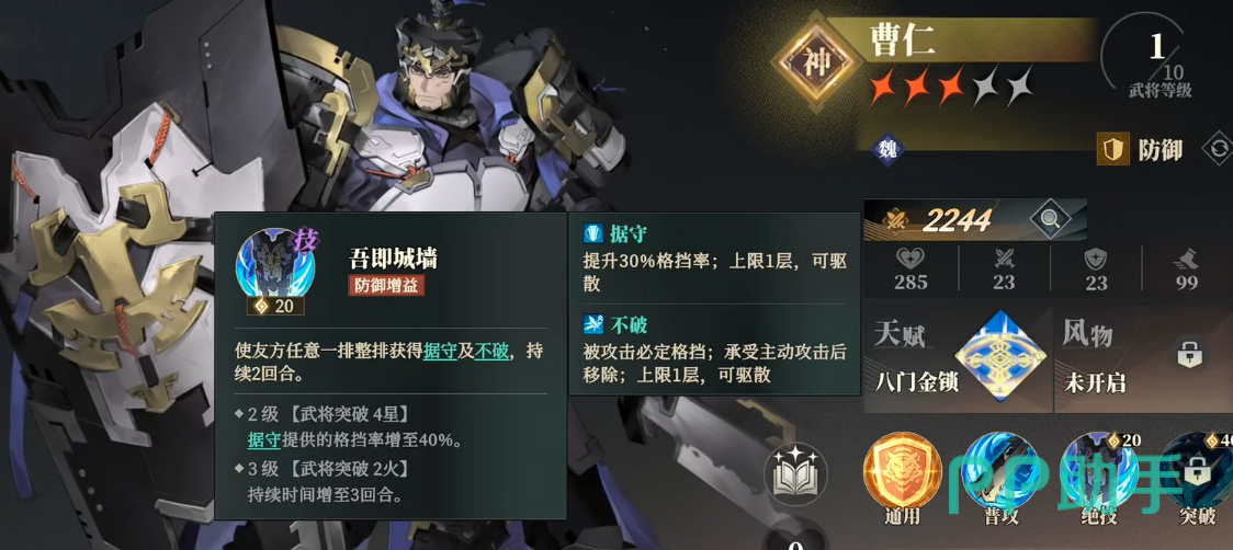 曹仁的天赋八门金锁,对每个队友来说,每有一个相邻友方就可以获得6%(14%)的免伤,加成职业阵法师提供的免伤,以及技能给到的格挡,构筑出了一个铜墙铁壁。