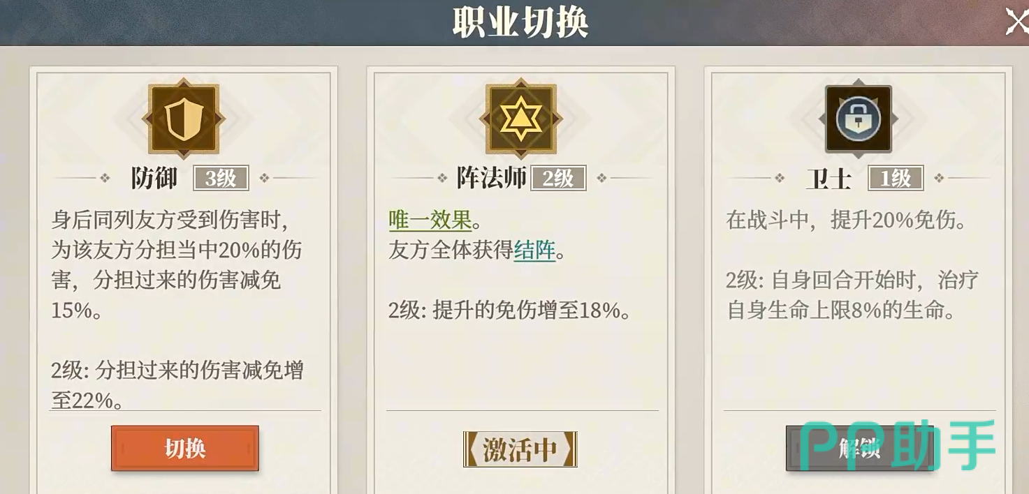 每个武将的进阶职业是不一样的,防御型武将最基础是防御,进阶职业有卫士、阵法师,还有其它的,具体武将之间有区别。很多人第一次遇到阵法师是在曹仁这个武将的进阶职业中看到的。