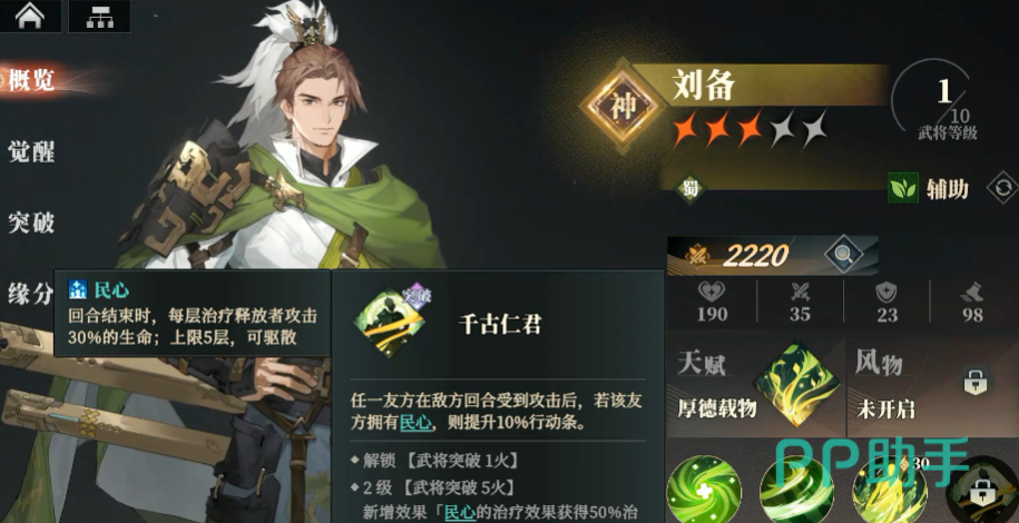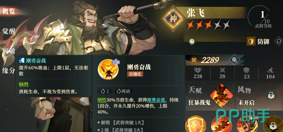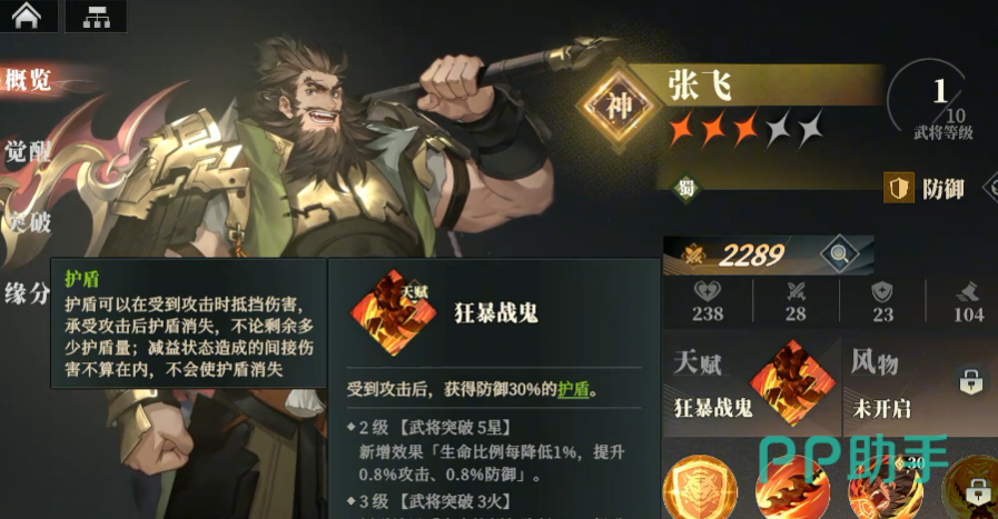 先来看看张飞,游戏里定位防御武将,普攻前排单体,绝技群体伤害附加降低敌人造成的伤害效果。突破技自损30%当前血量获得高额吸血和永久增伤。天赋则是在受到攻击后获得防御力一定比例的护盾。