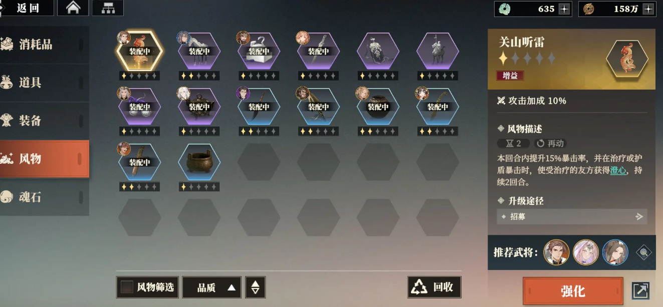 大部分关卡即使只用一套基础阵容也能获得奖励,不会过度依赖单一最强阵容,提升角色战力不只是升级,还需为角色配备武器装备、套装、风物才能显著提升战力。单个武将养成毕业所需资源较多,但整体而言是较为平滑的,并且资源获取途径也多。