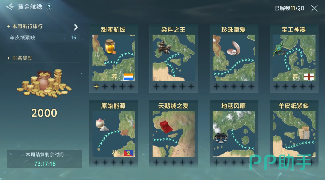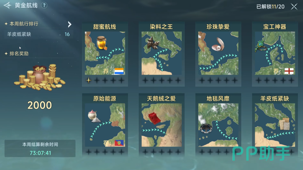 目前游戏里面有高达20条黄金航线,包括了七大海域,种类十分的丰富,黄金航线一共有5个星级,每个级别的要求都不一样,有的需要累积获益,有的需要单次收益,每完成一个星级,不仅能拿到一次性的钻石奖励,还能获得永久的台阶上线加成;排名靠前的玩家还能获得金币的奖励。
