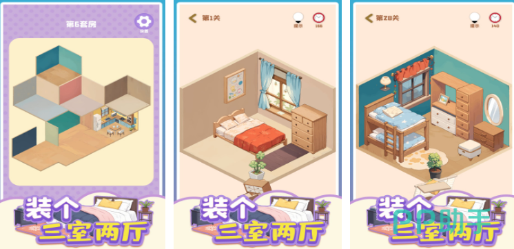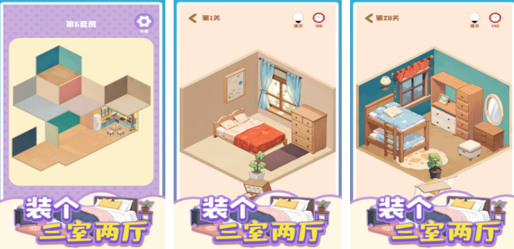 装个三室两厅游戏中,游戏开始会给玩家一批打包好的家具,每件家具都有指定的房间和位置,玩家需将其逐个拆开并按提示放置,通过点击纸箱获取家具,然后拖动到合适位置,部分家具可能还需调整角度以满足设计要求,游戏不只是简单的家具摆放,还要求玩家合理规划空间进行物品收纳,玩家要把小型家具和装饰品放在恰当位置,让房间整洁有序。