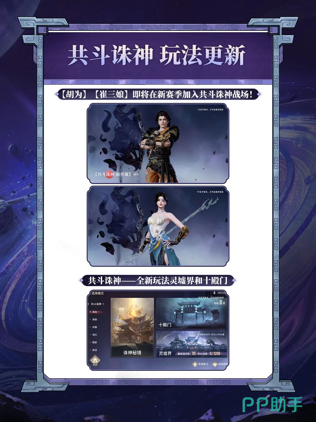 共斗诛神玩法全新更新,胡为和崔三娘是两个在新赛季加入到该玩法的英雄,拥有诛神模式的专属技能和奥义;还新添加了8种全新怪物,另外还有4个新万象BOSS登场。