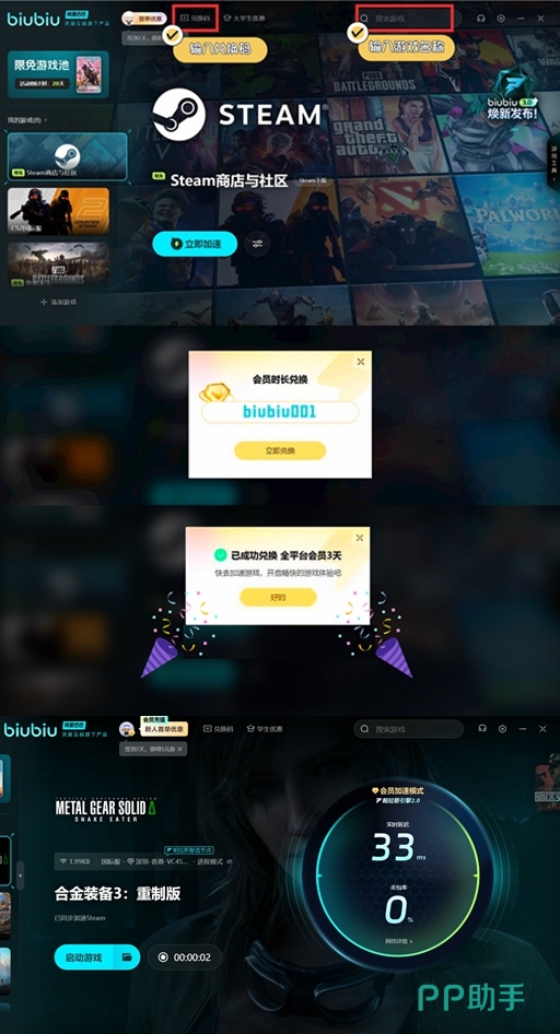 不过作为一个大制作的游戏,一般对于网络要求会比较高,如果网络卡顿将影响到游戏体验。这里就建议选择一款加速器新用户如果是首次注册,在第1次登录之后就有一个24小时的礼包。这并不是最终的加速时长,所有的用户都可以在加速器的首页复制口令【biubiu001】将获得一个3天的免费加速时长,对新用户而言可以叠加两种方法,一共免费96小时。