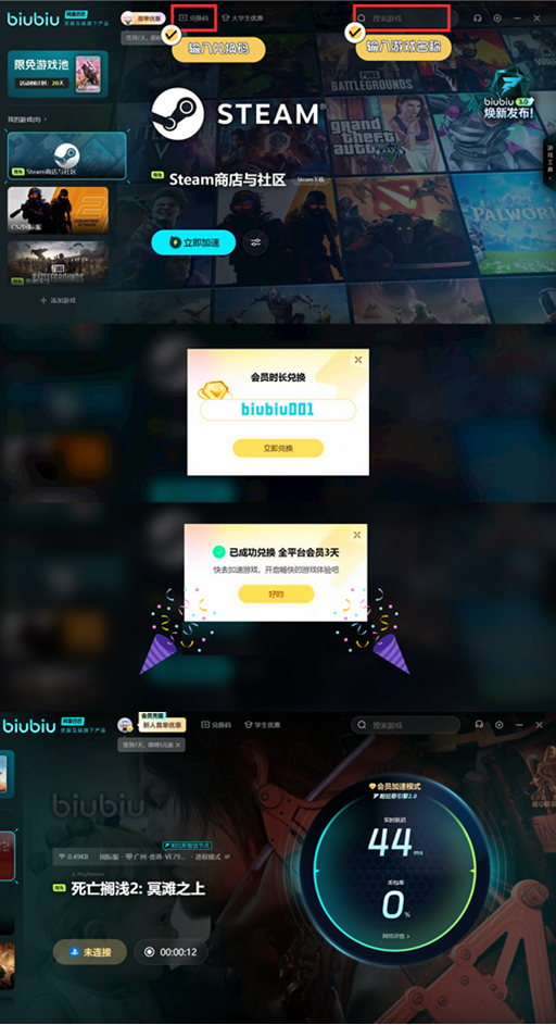 使用加速器优化网络可显著改善此类问题,小编推荐你使用biubiu加速器。而且它加速之外还有超多体验活动等你参加。输入兑换码biubiu001可兑换72小时免费加速,新人注册还能额外领取24小时,这样的话,甚至最多能领96小时的免费加速时间,确保BT遭遇战时技能释放与伤害反馈同步。