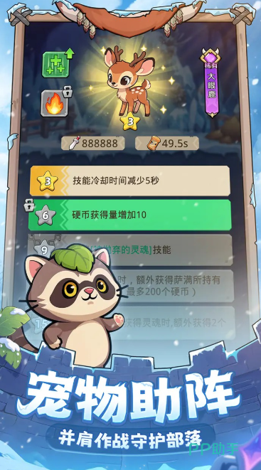 在游戏当中,也有宠物助阵的玩法,在宠物助阵模式内,玩家可以随机性的获取更高的属性值,其中就包含有“冷却时间减少五秒”,“硬币获取量增加十个”的特殊技能。
