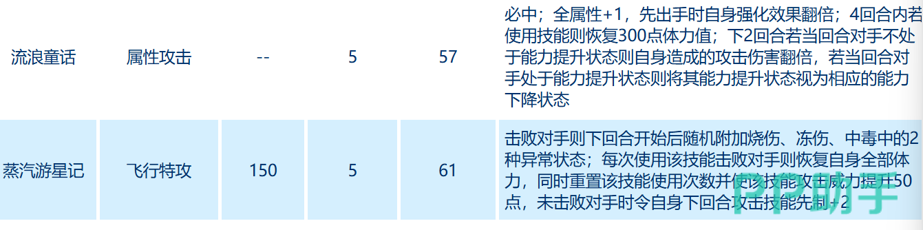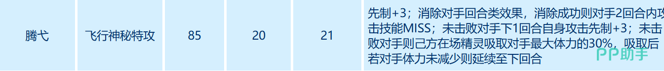 150点伤害的飞行特攻技能,该技能打中对手以后能够给对手附加上烧伤、冻伤以及中毒等异常状态,注意能够随机附加2种,而且该技能在把对手击败以后还能恢复自身的全部体力,充值技能的使用次数后,在次使用该技能时,攻击威力能够提高50点。