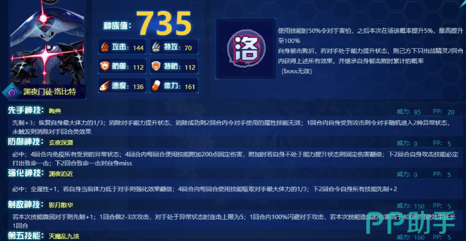 在游戏中,洛比特的种族值高达735,其中攻击跟速度是特别明显的,也就是说洛比特比较擅长攻击跟速度,所以说在游戏里面他拥有比较强悍的输出跟先手能力。玩家如果想要挑战他的时候,针对于他的技能,玩家先要了解洛比特的专属特性是渊夜之影,他能够令对手害怕,也能够随着战斗的进行,让对手害怕的概率大幅度的提升,最终可达到100%,这样的话就能够有效的去限制敌人的行动。