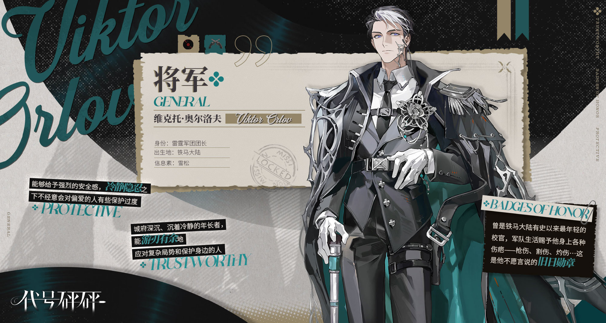 代号砰砰中的将军这个角色名字叫做维克托奥尔洛夫,这是一个安全感爆棚的男性角色,曾经的他是铁马大陆中有史以来最为年轻的军官,因为曾在军队生活过很长的一段时间,让他的身上布满了各种伤疤,曾经军队的生活已成为了维克托不愿意说的过去。