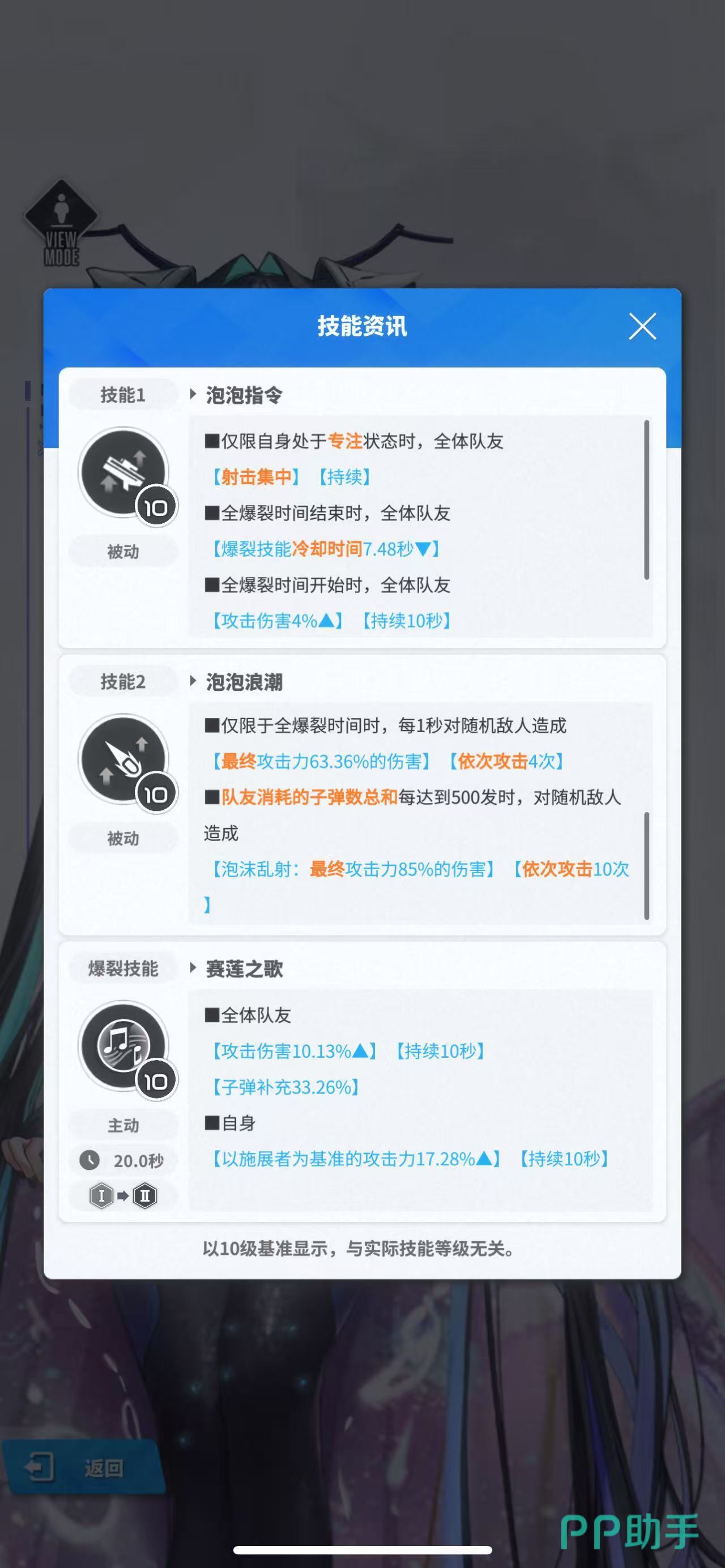 二技能叫做泡泡浪潮,全爆裂时间时,每1秒对随机敌人造成高额伤害,并攻击四次。队友消耗的子弹数总和每达到500发时,对随机敌人形成高额的泡沫伤害。大招叫做赛莲之歌,可以提升全体队友的伤害以及弹药填充数,并获得高额攻击力加成。