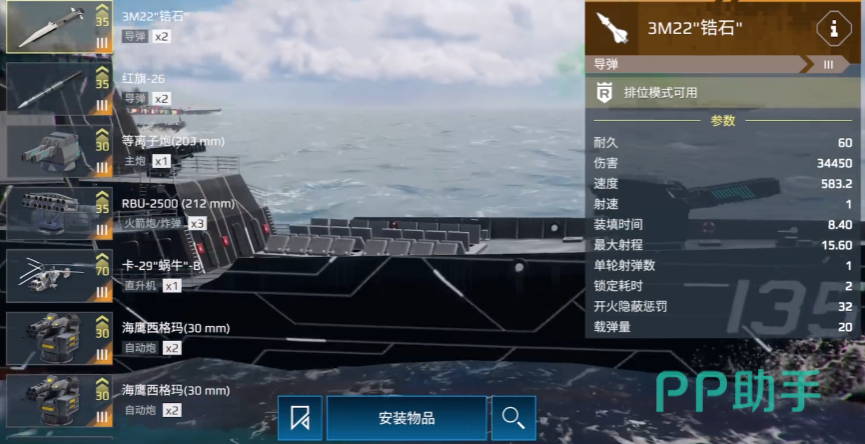 一号导弹槽位采用的是登录签到送的鹰击21,二号槽位用的是40式高超滑翔弹,主炮可以用英炮,也可以用sh16。火箭弹用的是Rbu-10000,很适合用来刷人机。