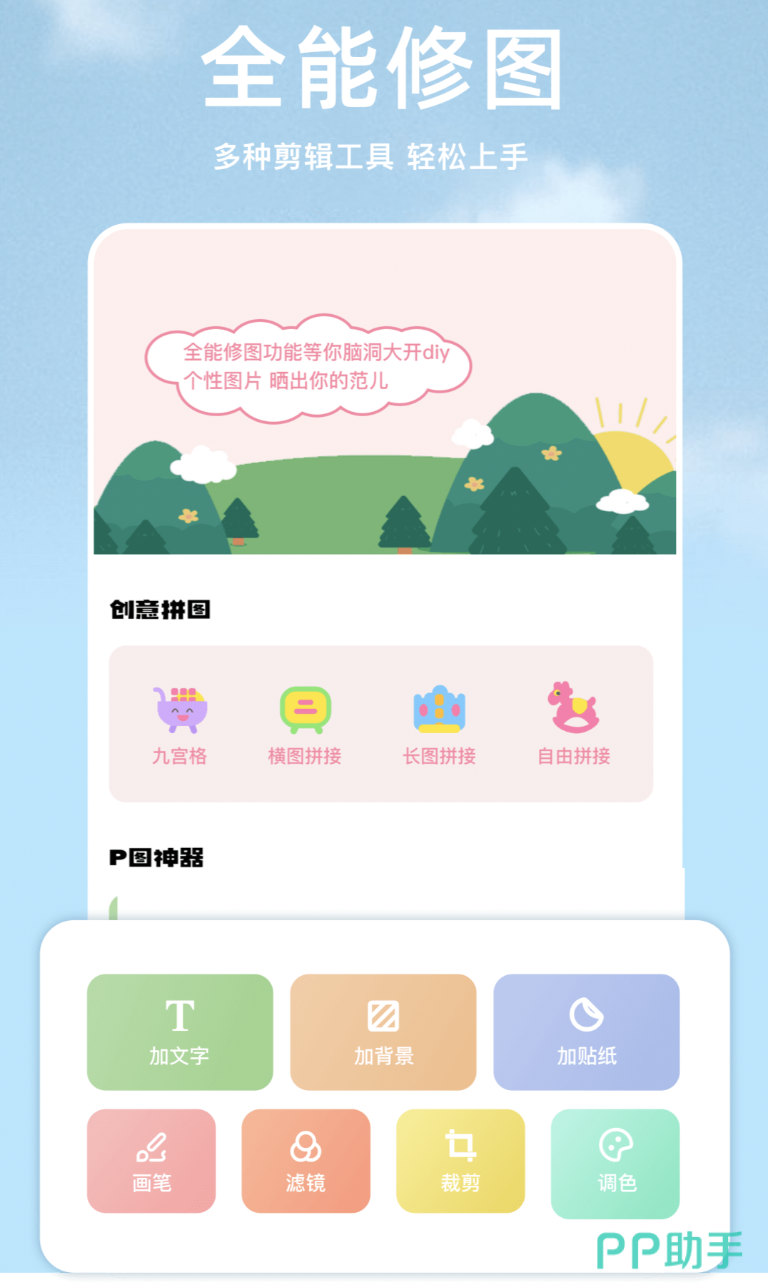 APP里面的图片编辑,非常的便捷,可利用图片进行简单的拼贴拼接,添加水印等操作,还可以任意裁剪多种功能。在线编辑,在线定制水印,去除水印图片,压缩图片标注等等。