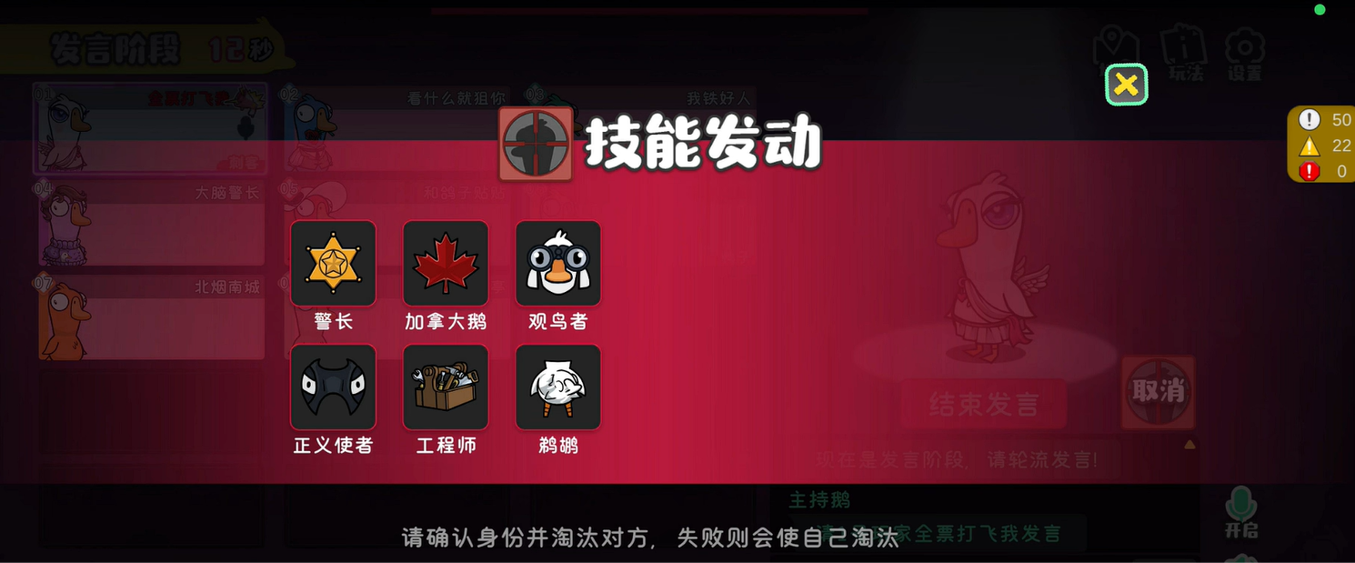 在会议中建议大家隐藏个人身份,并将怀疑目标转移到其他鹅身上,一些带有特殊身份的刺客还会带有一些独特的技能。谨慎使用这些技能的话就可以更快获胜,例如在会议投票环节,刺客可以选择一名玩家并猜测其身份(如警长、正义使者等)。猜对目标立即死亡,且不会触发报警,刺客身份不会暴露;猜错刺客自身死亡,相当于“子弹反弹”。