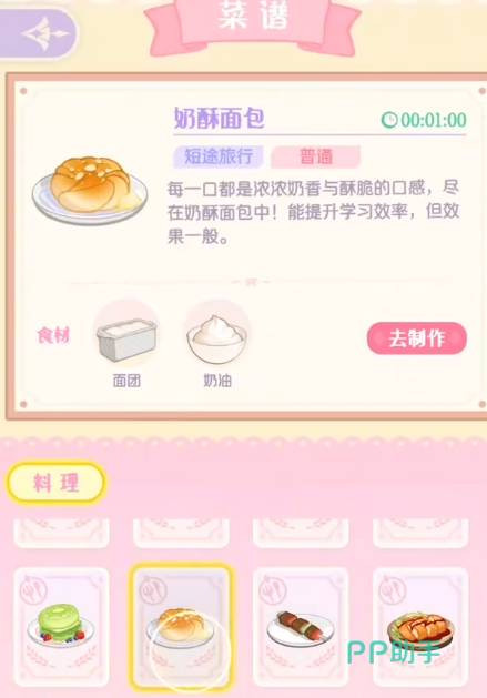 之后大家要是想制作短途旅行的食品,那就同样可以使用奶油,再搭配一份面团的话,就可以制作出一份奶酥面包。这种面包具备着浓厚的奶香味以及酥脆的口感,而且可以提升角色的学习效率,让他更快的掌握一门技能。