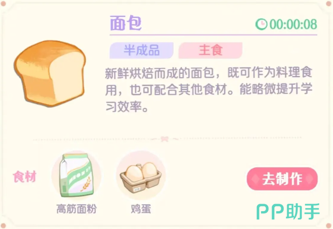 想要制作面包的话,就需要准备面粉以及鸡蛋,还要将其裹成面团之后再进行烘焙才能够获取面包,跟以往的简单烹饪并不一样。然后制作时间也非常快速,只需要花费8秒钟就可以获得一个面包,因为大家打算制作其他食物的话,所需要花费的面包数量更多。
