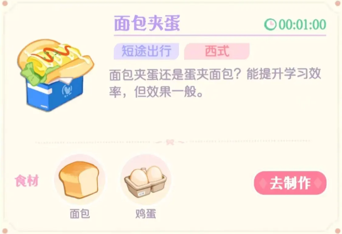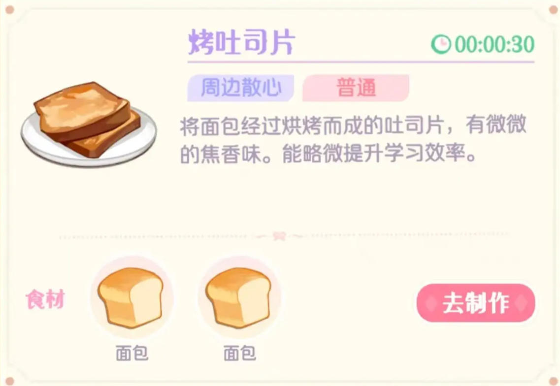 例如烤吐司片,这是一种由面包精心烘焙所制作出来的食物,带有淡淡的焦香味,可以稍微提升你的学习效率。需要花费两份面包才可以制作而成,更加适合早餐时让角色使用,这样就能够提升学习某种技能的效率。