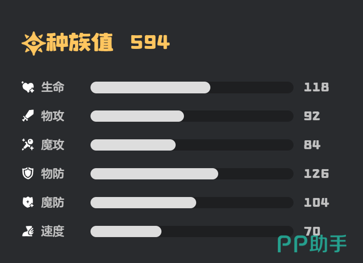 九幽菇在洛克王国世界中是一种各种属性都相当均衡的精灵,它的生命值为118、物攻和魔攻分别为92和84、物防和魔防分别为126和104、速度为70。
