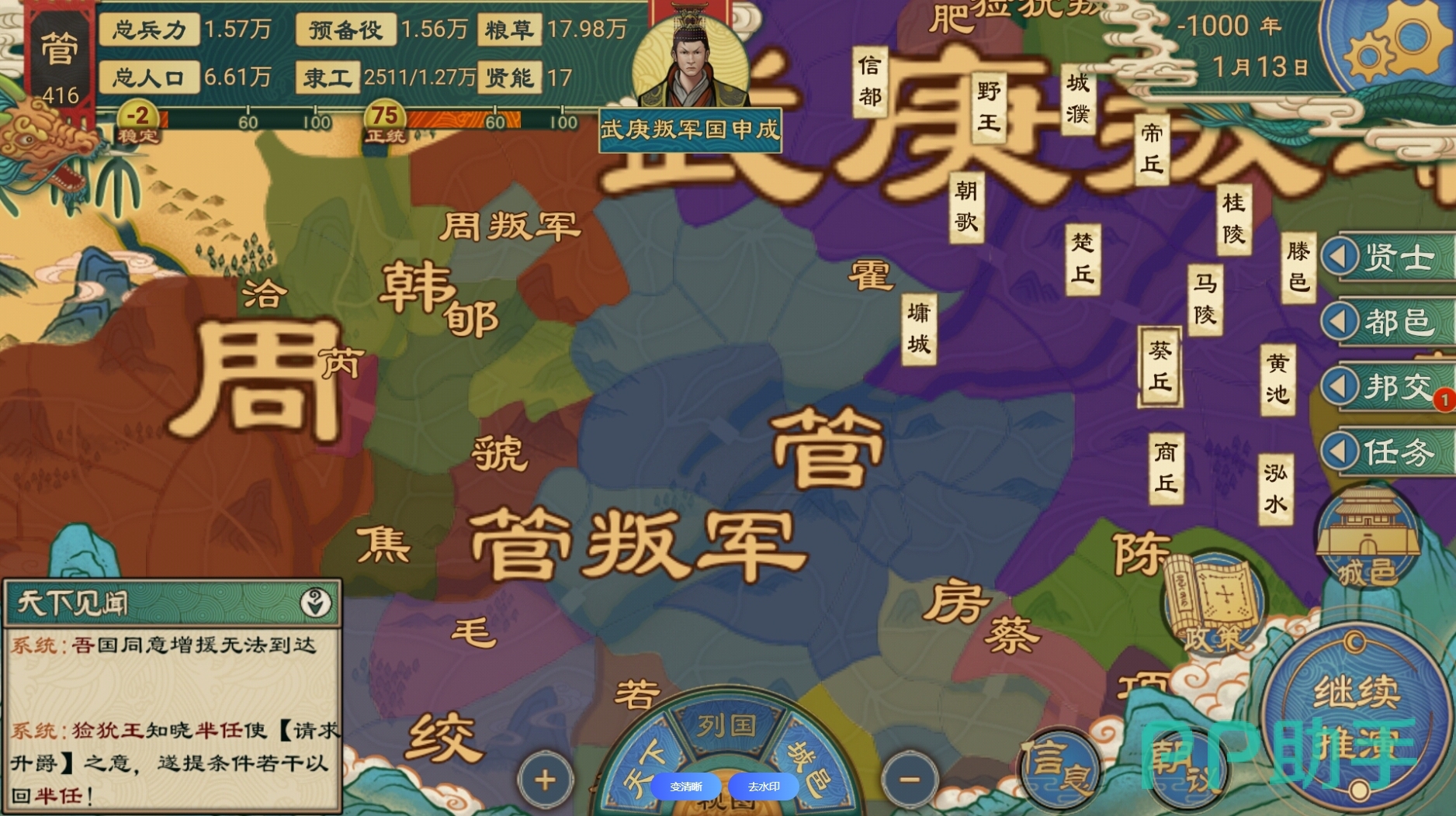 《大周列国志》为玩家展现出了百家争鸣的场面,将会经历周王末期到七国争霸的年代。玩家可以开启王朝模式,从一个小国不断发展,逐渐实现大一统目标。游戏内有不同流派和实力的官员,根据每个官员特点安排到合理的位置,能够让国家运转更出色,实力也会快速提升。