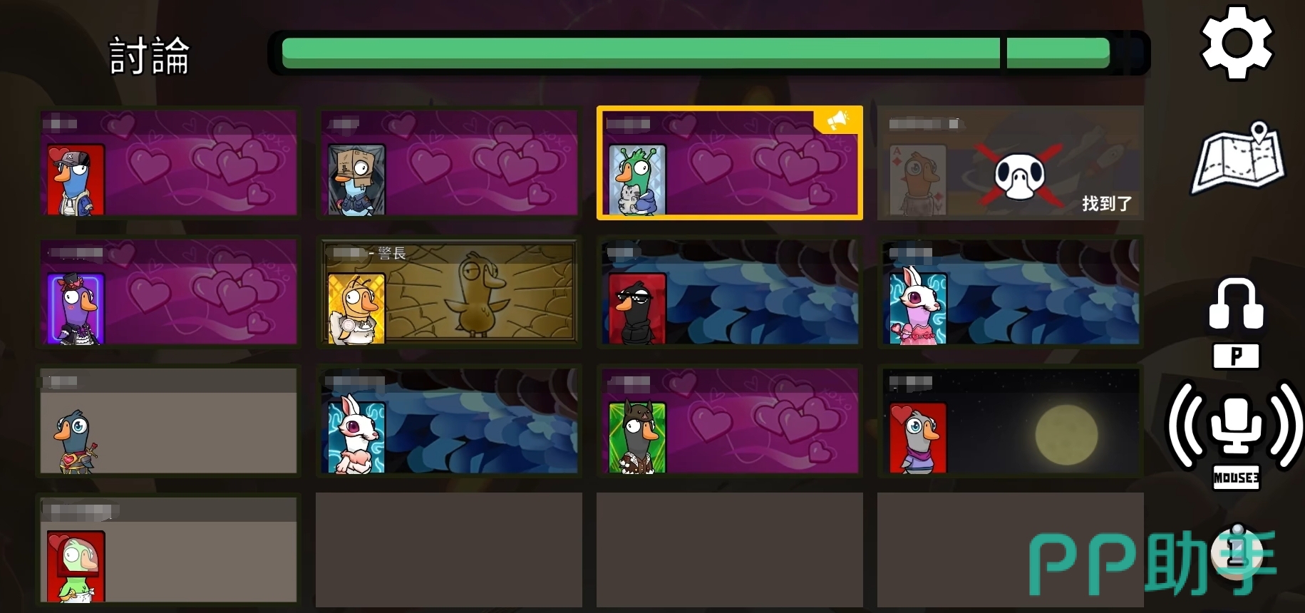 进入到第一次讨论后,若是信息拿得差不多,或是已经确定了哪位玩家是鸭子阵营里的角色,那警长可以出来带节奏,引导好人阵营的行动。反之,在拿不全信息,或是没有明确目标时,最好隐藏一下自己,听一下其它玩家的发言,然后再决定自己要刀的目标。