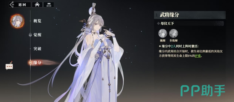 再来看甄姬的天赋,可以在队友进行攻击的时候触发,此时甄姬自身有50%的概率进行协战,而甄姬的缘分羁绊,是跟步练师可以一起触发的,这个母仪天下的羁绊,是会为生命比例最低的其他友方提供等同于其生命上限8%的护盾。