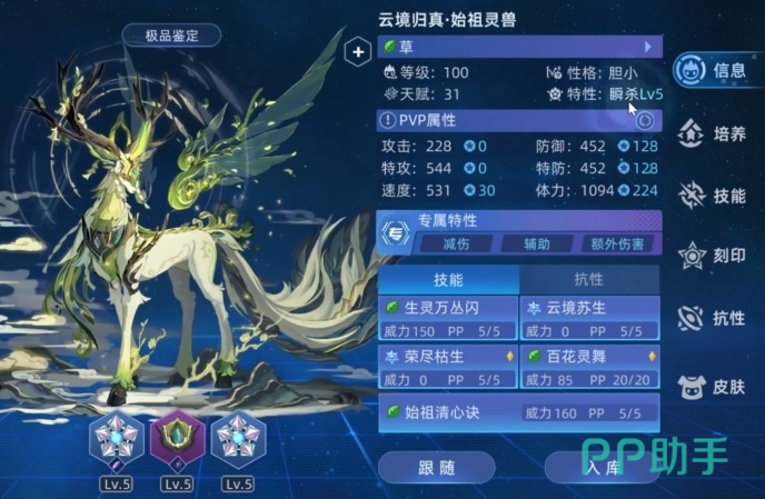 百花灵舞技能具备多重强大效果,它可以吸取对手能力提升状态,一旦吸取成功,自身便能免疫下1次受到的异常状态,这在面对强化型且擅长施加异常状态的对手时,有着极大的优势,既能打断对手的强化节奏,又能为自身提供一层保护,荣尽枯生技能使用后,5回合内免疫并反弹所有受到的异常状态,这让云境归真・始祖灵兽在面对擅长异常干扰的精灵时,不仅自身不会陷入异常,还能将异常反弹给对手,打乱对方节奏,复苏之光技能使用技能可以恢复体力值,为云境归真・始祖灵兽提供了一定的续航能力,在战斗中能够持续保持自身血量健康,虽然每回合恢复的体力值不算多,但在持久战中,点滴的恢复也可能成为决定胜负的关键因素。