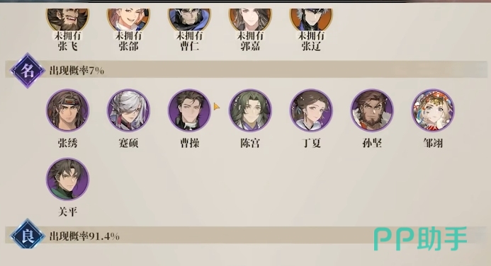 再看看其他角色,从综合概率的角度而言,大约是2.8%,而名将的出现概率则为7%,对比良将来看,名将的获取难度确实要稍高一些,值得一提的是,良将的抽卡概率实际上是最高的,有着91%左右的数值哦,这类角色在游戏初期,是能够发挥出一定作用的,可以帮助玩家更好地过渡,搭建起初期的阵容框架。