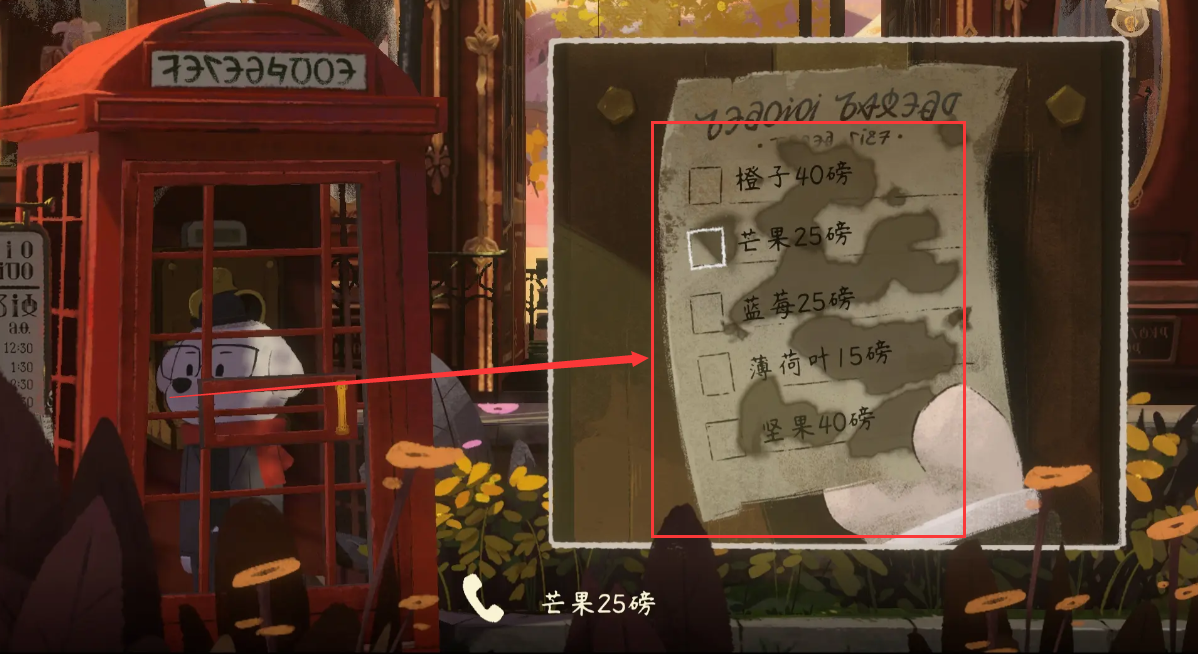 在这之后,玩家一定要掀开身边的海报,这样才能够获取面包店的订购电话号码,在这之后,玩家需要找到水果店,并且和水果店老板对话,从对话中获取污垢的订货清单,至此,第一个节点就完全结束了。