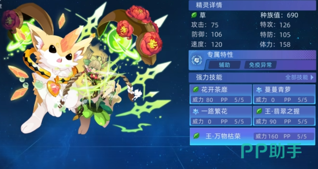 灯转福来是花灯仙子的先手神技,它可以吸取并反转对手能力提升状态,一旦成功便能打乱对手的强化节奏,若自身处于能力提升状态,每次攻击还能恢复自身体力的一部分,大大增强了自身的续航能力,若对手处于能力下降状态,则使对手随机技能的PP归零,有效干扰对手的技能释放,祥灯天意是一个必中技能,使用后4回合内免疫所有受到的异常状态,这在面对擅长施加异常干扰的精灵时,能够让花灯仙子从容应对,自身不会陷入异常,保证技能释放与战斗节奏。