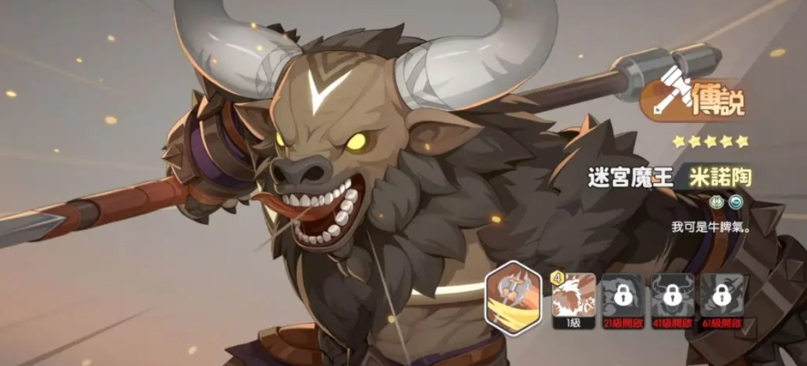 第二个就是迷宫魔王米诺陶,他那庞大而狰狞的外形或许会让大家误以为他只是如史莱姆王般的蛮力角色,但实则不然,米诺陶的技能机制复杂而强大,每一个技能对于局势都有影响,他自带免控特效,攻击提高的属性让他的每一拳都有更高能力,他的天赋和奥义中都有着不同程度的范围控制效果,一旦发动敌人便难以挣脱,在释放技能的过程中他还会持续为自己加持攻击力,伤害高的同时控场能力更是强到可以控住对面所有敌人,如果大家想要进入旷野队或彼岸队,那么米诺陶绝对是大家不可多得的得力战将,建议给他配备攻速装和暴击装。