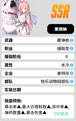 莱昂纳尤其是在提升暴击率和霰弹枪队友的战斗力方面,表现得尤为出色,人设当中莱昂纳在快乐动物园部队中是一个重要的角色,她不仅是团队中最年长的成员,更是猛兽们的管理者,无论是狮子、老虎等凶猛的动物,都会服从她的指令,在战斗中莱昂纳则化身为团队的辅助核心,拥有全方位的增益效果,从战斗能力来看,莱昂纳的普通攻击霰弹枪能够造成高额的枪击伤害,并且拥有9发的装弹数,虽然换弹时间需要1.5秒,但在持续输出方面表现还可以。