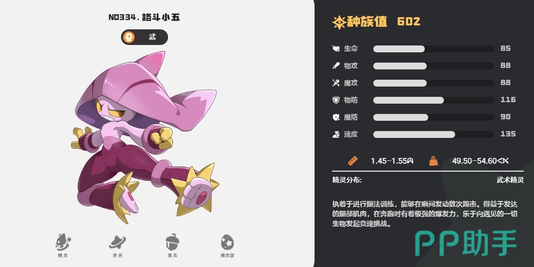 接下来是格斗小五身上,格斗小五对腿法训练有着一种执着的追求,它发达的腿部肌肉,就是自己的战斗利器,凭借着这强健的腿部力量,格斗小五可以在瞬间发动数次攻击,不仅如此它在奔跑时也有着极强的爆发力,格斗小五生性活泼好动,作为格斗家族中的一员,格斗小五在格斗方面更是有着非常出色的天赋,它拥有众多的战斗技能。