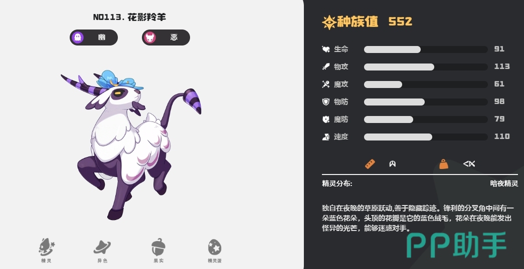 花影羚羊也是恶系精灵中不容小觑的存在,这只精灵的种族值高达596,它的特性更是在释放恶系技能时,可以使敌人失去4点能量,要知道在游戏的战斗中,能量对于精灵的技能释放至关重要,而花影羚羊这一特性就让敌人在释放技能时可能会受到极大的限制,当它对敌人造成伤害时,若敌人的能量为零,伤害则会翻倍,而且它自身还有一个独特的设定,那就是生命值越低输出反而更高,花影羚羊不仅能够打持久战,在长时间的战斗中凭借强大的续航能力和逐渐提升的属性占据上风,还能在关键时刻迅速击败敌人。