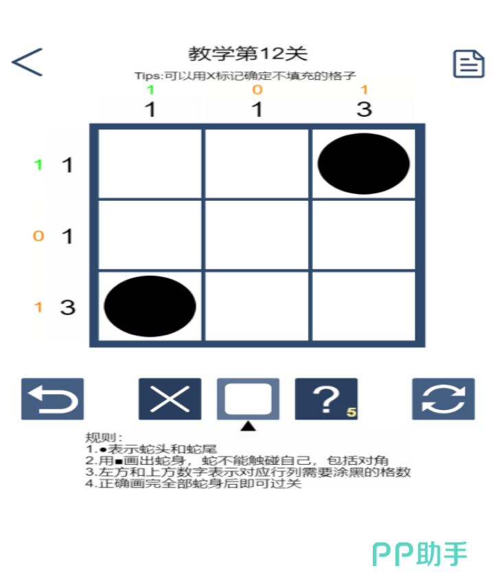 在玩这款游戏的时候,屏幕上会给出相应的提示内容。像方格旁边标注的数字,它其实是在告诉我们这一行或者这一列里需要画出多少个蛇身方格。玩家得依据这些数字,在规定的区域里描绘出蛇的样子,要把代表蛇头和蛇尾的圆点,用画好的蛇身方格连接在一起。而且要注意,画蛇身的时候不能让它碰到自己,就算是对角方向也不行,所以玩家得好好琢磨路线。