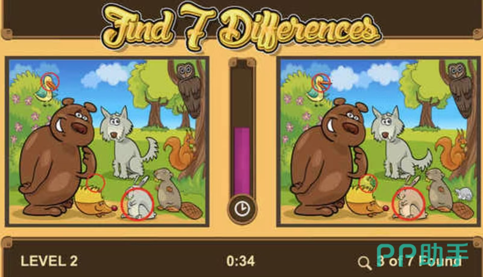 《找茬找不同动物版》设计了众多的闯关关卡,玩家需要从众多的小动物图片中找不同,每次会给玩家左右两张照片,成功的找出他们之间不同的地方,玩家就可以顺利的来到下一关。在游戏的中间可以看到时间条,时间调会随着时间流逝不断的减少。必须在实践结束之后成功的完成,这款游戏非常的老少皆宜,适合所有年龄段的朋友们去挑战。