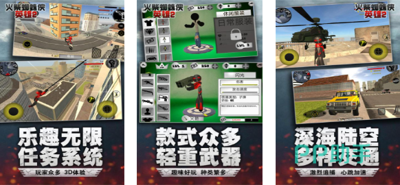 这款英雄主题的手游中蜘蛛侠拥有着可爱的火柴人造型,可使用的武器除了蛛丝还有一些强大的枪械,海陆空多样载具随意切换增加了机动性,多元化任务系统让游戏显得乐趣无限,款式众多的蜘蛛侠皮肤、辅助道具也等待大家收集,地图展现立体还具备明显的火柴人背景风格,化身火柴人蜘蛛侠冒险的感受也十分爽快哟。