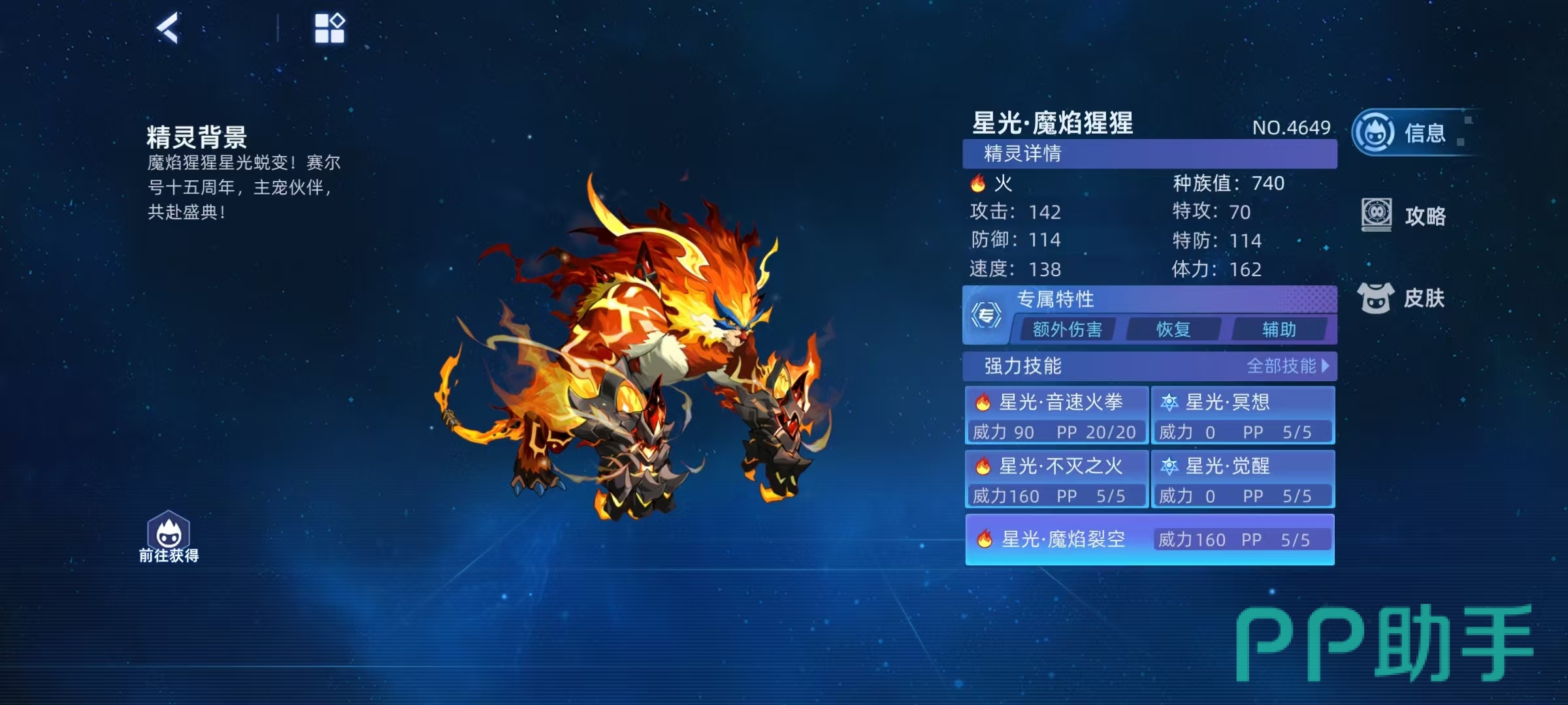 星光冥想,属性攻击类型,主要效果除了在四回合之内可以免疫并反弹异常状态之外,只要命中后,就有80%几率使得对手焚烬。如果没有成功触发,接下来的两回合之内有60%几率在攻击时使对手害怕;三回合内,每回合攻击都能附加伤害,这个伤害是按照自身攻击和特攻这两项属性中,最高一项的50%来计算的。星光不灭之火,这个技能属于特殊攻击,威力非常大,还能将对手的能力提升状态消除,消除成功时有固定伤害附加;对手处于星芳之缠时,技能造成的攻击伤害提升75%,自身体力低于对手的时候效果翻倍;如果触发致命一击,则恢复自身所有体力;三回合内,每回合都能附加固定伤害。