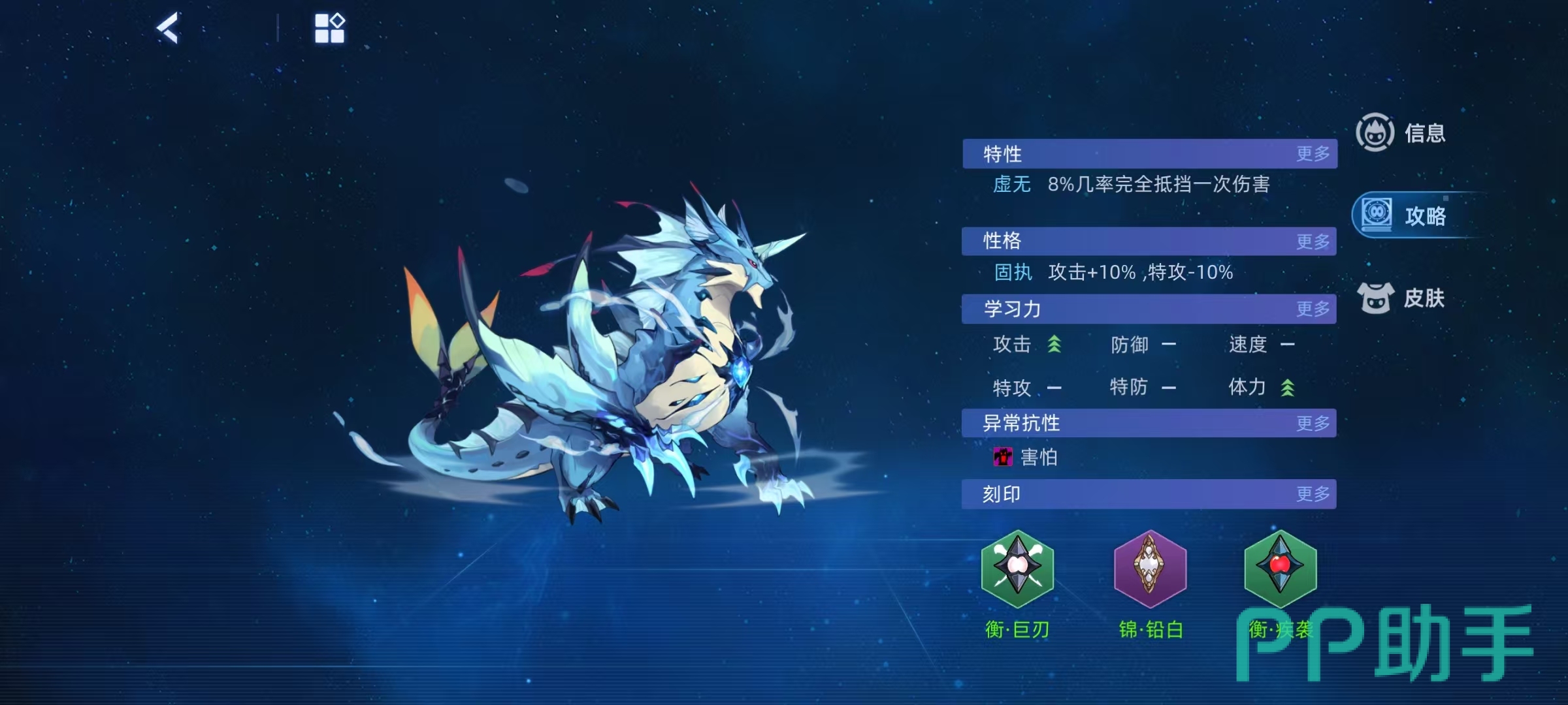 星光随风逐浪,自身属性加1,当前体力高于最大体力的1/2时,强化效果翻倍,下两回合自身造成的攻击伤害翻倍,攻击忽略对手25%双防值。若自身选择使用技能,则无视对手能力提升状态。星光排山倒海,可无视攻击免疫效果,无视对手护盾效果,命中后50%使对手冰封,给对手造成伤害时,按照伤害数值的50%来恢复自身体力。星光浪打千击,一回合打出5~10次攻击,每次攻击都有几率提高自身攻击、速度和命中加1,消除对手回合类效果。为了强化优势,培养的时候选择虚无特性,有几率抵挡伤害。性格推荐固执或者是调皮,孤独也可以。学习力选择提升攻击和体力,异常抗性选择免疫害怕或者是免疫麻痹。