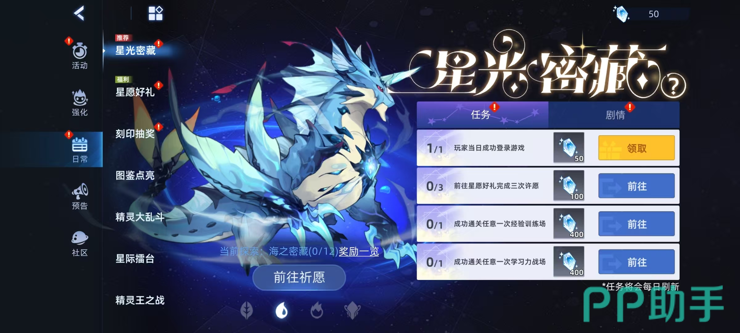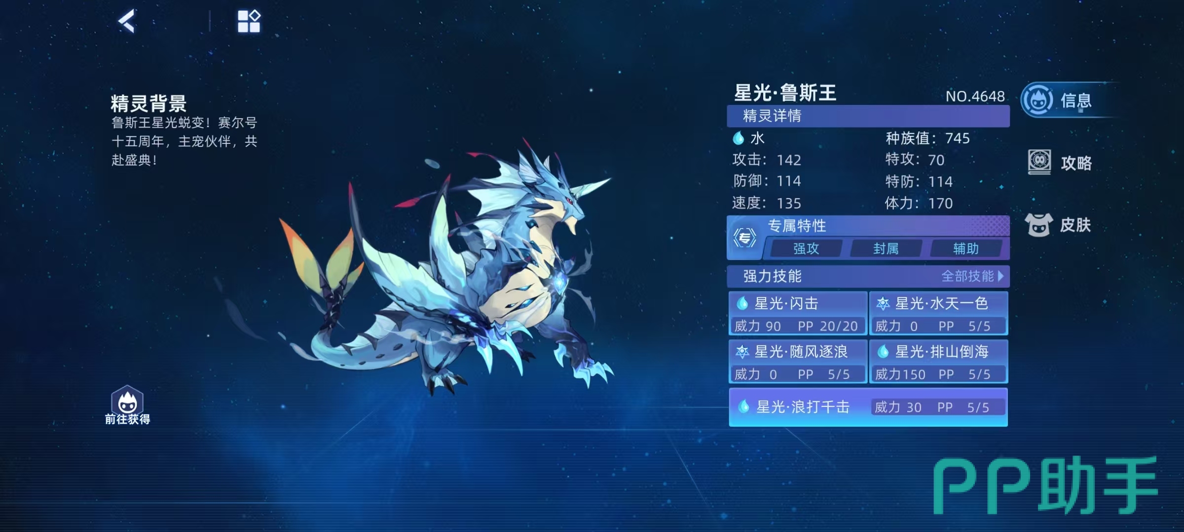 玩家在手游中只需要参加星光密藏活动,在探索海之密藏的页面中完成任务,就可以领取到这个精灵。星光鲁斯王的专属特性有强攻、封属、辅助等,而且这些特性对boss也是有效的,这些特性使得自身还有额外效果,例如每次使用攻击后,会附加三回合的星海之浸,自身所有技能必定打出致命一击等。所具有的强力技能包括星光闪击,星光水天一色,星光随风逐浪,星光排山倒海和星光浪打千击。