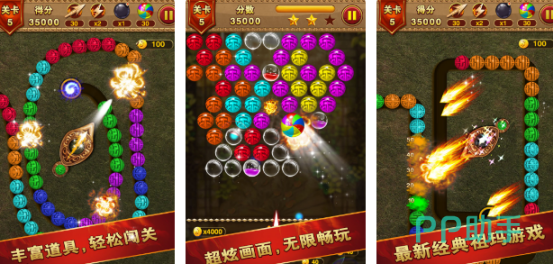 作为特别经典的一款消除类手游,凭借着怀旧又复古的风格,给玩家带来了沉浸式的体验,在开局之后,彩色的珠子会在轨道上缓慢前行,不过在中心位置也会呈现出不同颜色的珠子,玩家要通过精准瞄准的方式,将相同颜色的珠子放在一起就能快速消除,消除的越多获得的分数就会越高,简单易上手的操作方式,只要点击屏幕就能够疯狂射击,还要精准瞄准。