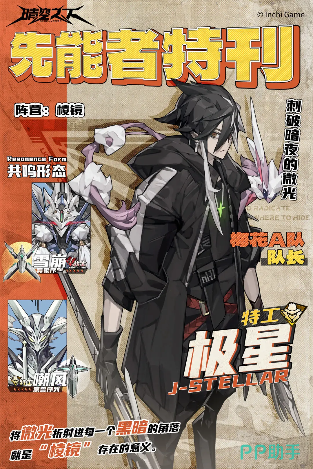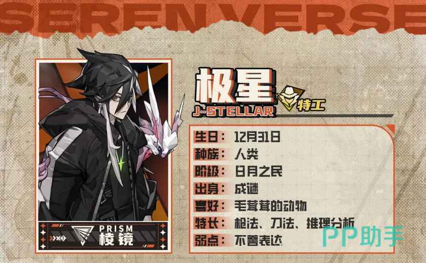 极星是棱镜阵营的英雄,具备很高的责任感,拥有很优秀的战斗天赋,在短短几年迅速的成长为优秀的小队长,寡言少语的他擅长分析,具有领袖的气质。作为综合性的近战职业,具备一定的输出能力和机动性,还拥有专属的远程攻击手段。